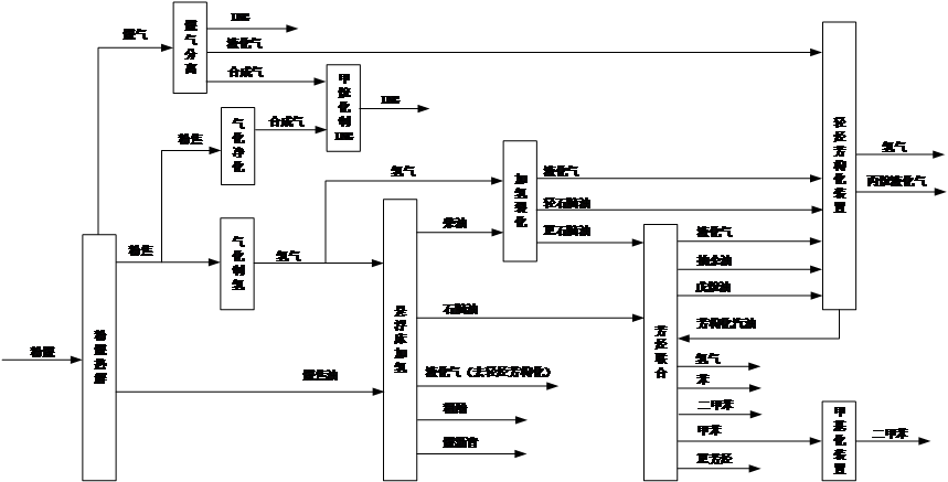 規(guī)劃以煤炭資源為基礎,將煤化工領域的粉煤熱解、焦油加氫、煤氣凈化以及石化領域的加氫裂化、芳烴聯(lián)合、輕烴芳構化等生產技術進行耦合,實現(xiàn)煤炭分質利用制芳烴,完成煤炭的分質、清潔、高效轉化,減少了對石油原料的依賴性,實現(xiàn)了煤代原油大批量生產芳烴的可能性。
