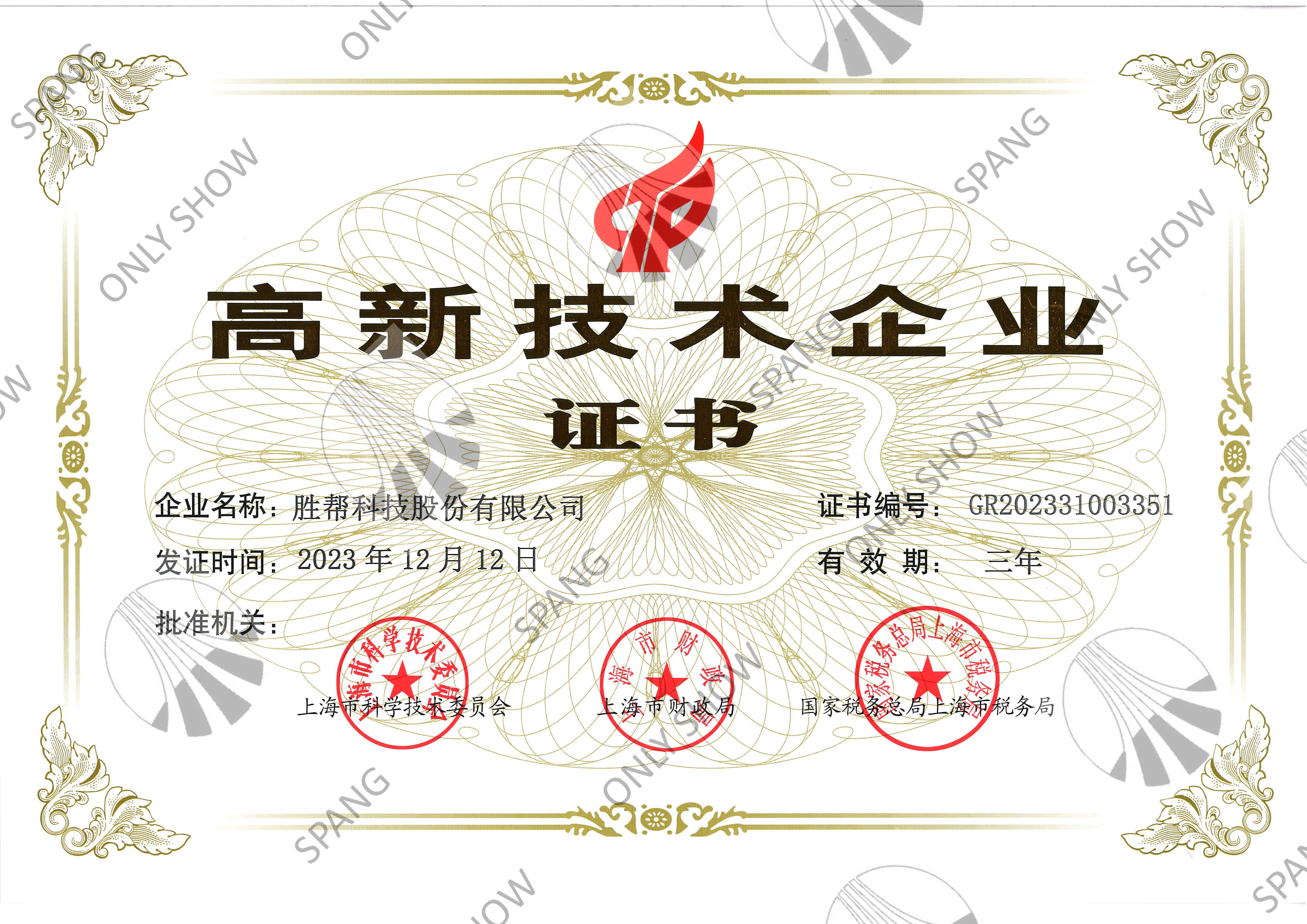 高新技術(shù)企業(yè)證書(shū)