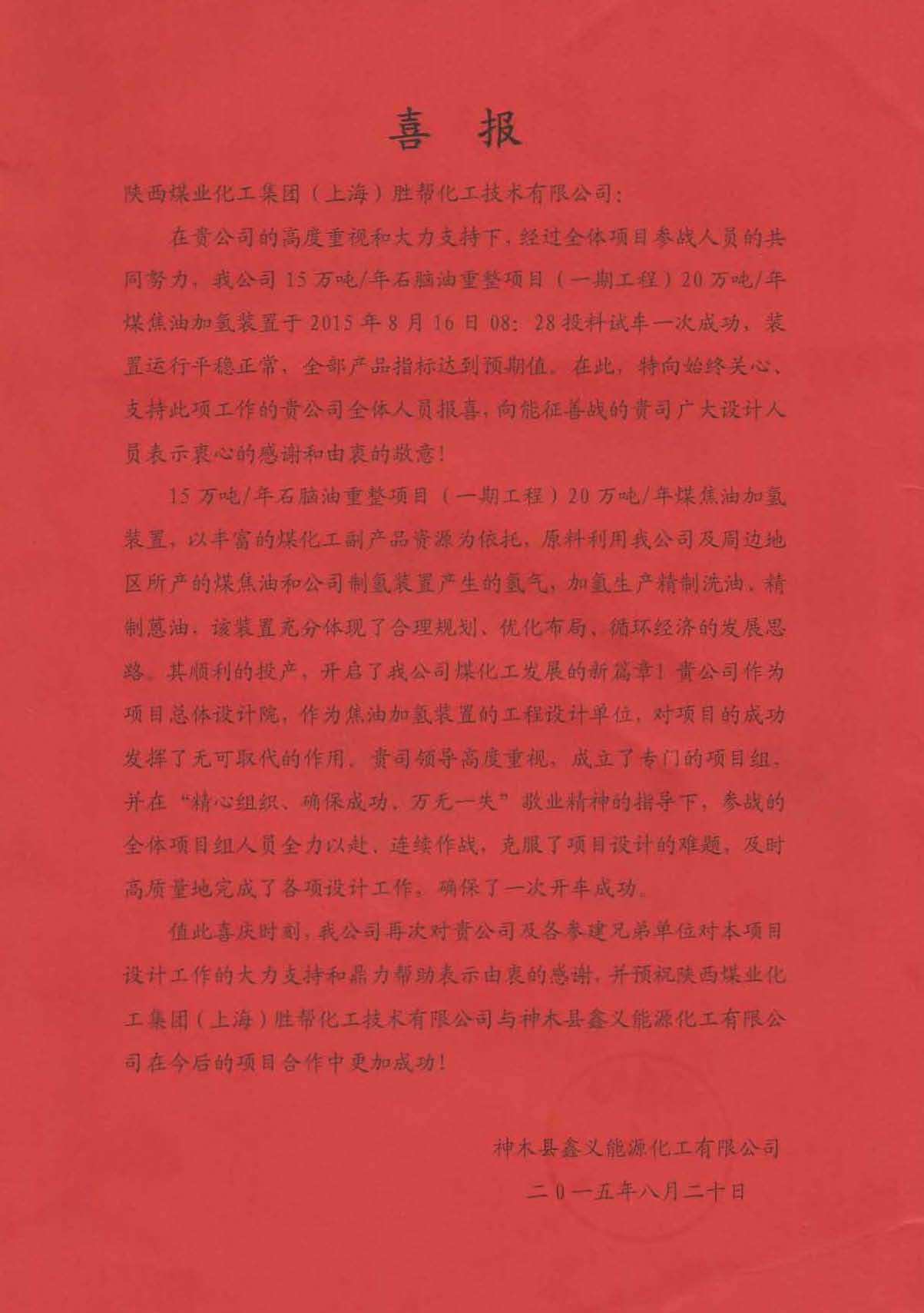2015年8月,由陜西煤業(yè)化工集團(上海)勝幫化工技術(shù)有限公司承接的神木縣鑫義能源化工有限公司65萬噸/年煤焦油加氫綜合利用建設工程一期20萬噸/年煤焦油加氫裝置順利投產(chǎn),是繼黑龍江寶泰隆、內(nèi)蒙慶華之后,又一個投產(chǎn)項目。神木縣鑫義能源化工有限公司特向我公司發(fā)來喜報。 陜西煤業(yè)化工集團(上海)勝幫化工技術(shù)有限公司為該項目總體設計院,作為焦油加氫裝置的工程設計單位…