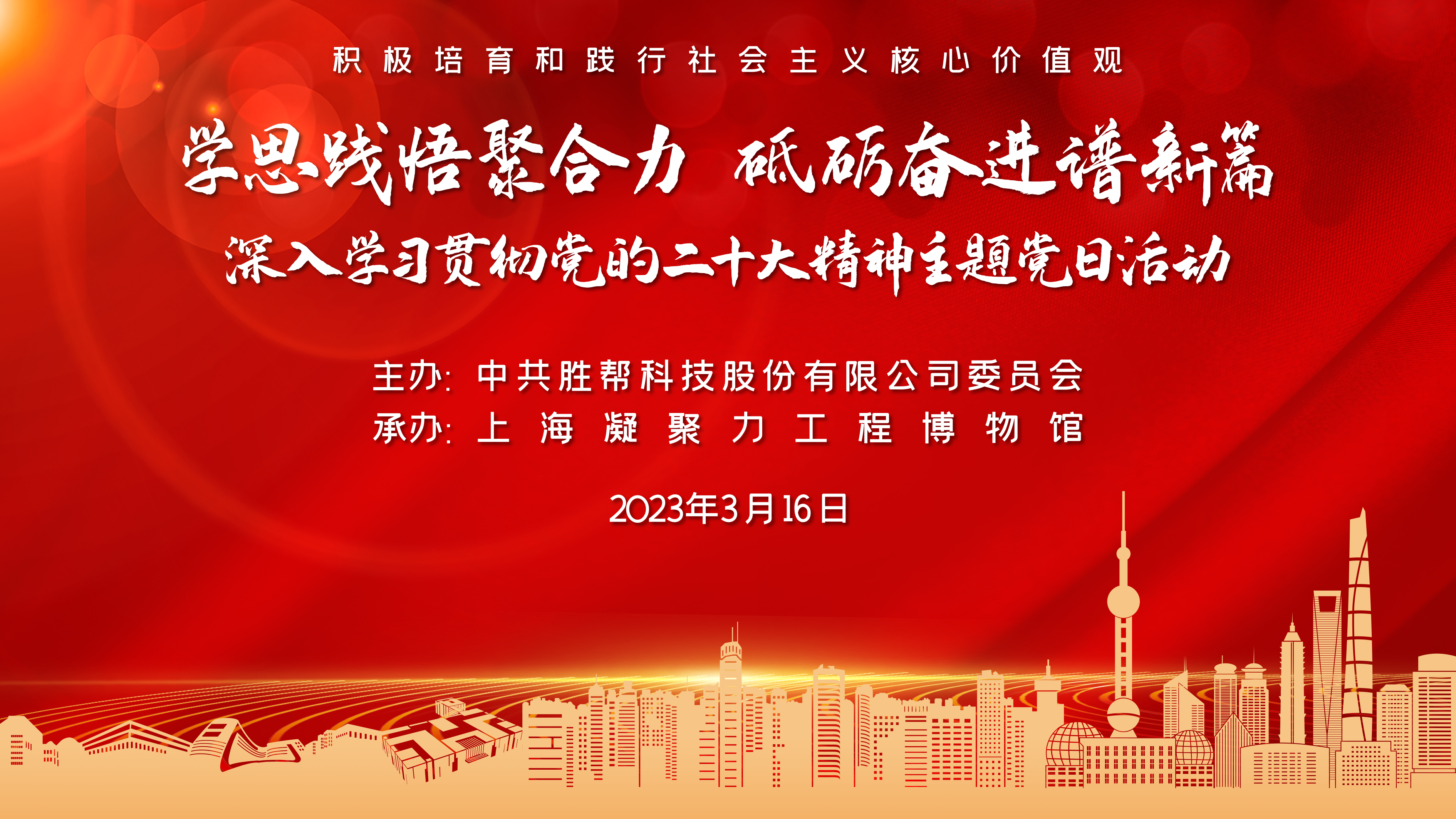 為深入學(xué)習(xí)貫徹黨的二十大精神,切實(shí)把黨員干部的思想和行動統(tǒng)一到黨的二十大精神上來,提高政治站位,砥礪奮斗初心,推進(jìn)集團(tuán)公司高質(zhì)量發(fā)展,3月16日,勝幫科技股份有限公司第一黨支部、第二黨支部、第三黨支部赴上海市凝聚力工程博物館開展“學(xué)思踐悟聚合力,砥礪奮進(jìn)譜新篇——深入學(xué)習(xí)貫徹黨的二十大精神”聯(lián)合主題黨日活動。各支部書記及預(yù)備黨員、發(fā)展對象、入黨積極分子…