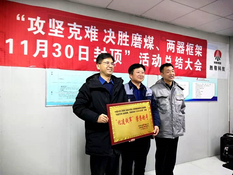 2020年12月1日,在勝幫科技熱解啟動(dòng)工程項(xiàng)目部會(huì)議室隆重舉行榆林化學(xué)1500萬噸/年煤炭分質(zhì)清潔高效轉(zhuǎn)化示范項(xiàng)目熱解啟動(dòng)工程“攻堅(jiān)克難 決勝磨煤、兩器框架11月30日封頂”活動(dòng)總結(jié)表彰大會(huì)。榆林化學(xué)公司各職能部門經(jīng)理、120項(xiàng)目項(xiàng)目經(jīng)理劉振虎、勝幫科技股份有限公司董事長(zhǎng)朱保平、北京華夏監(jiān)理公司總監(jiān)理工程師祝衛(wèi)東、中化三建副總經(jīng)理蔡向陽、中化三建分公司經(jīng)理歐陽寧等出席本次會(huì)議。