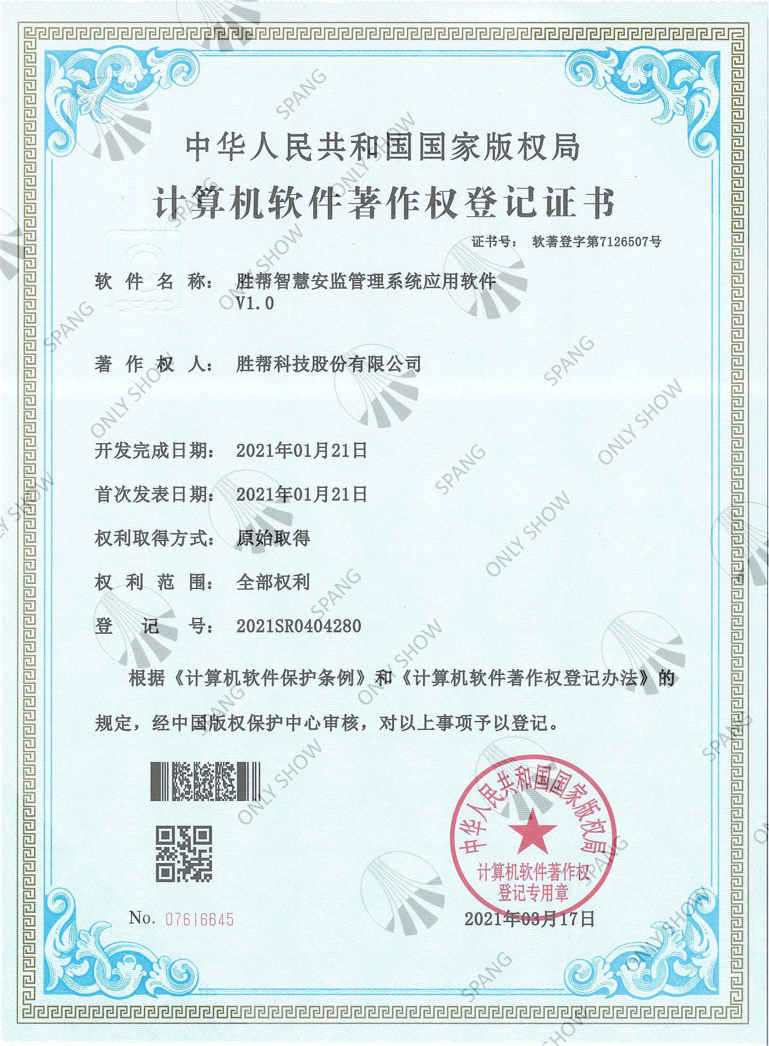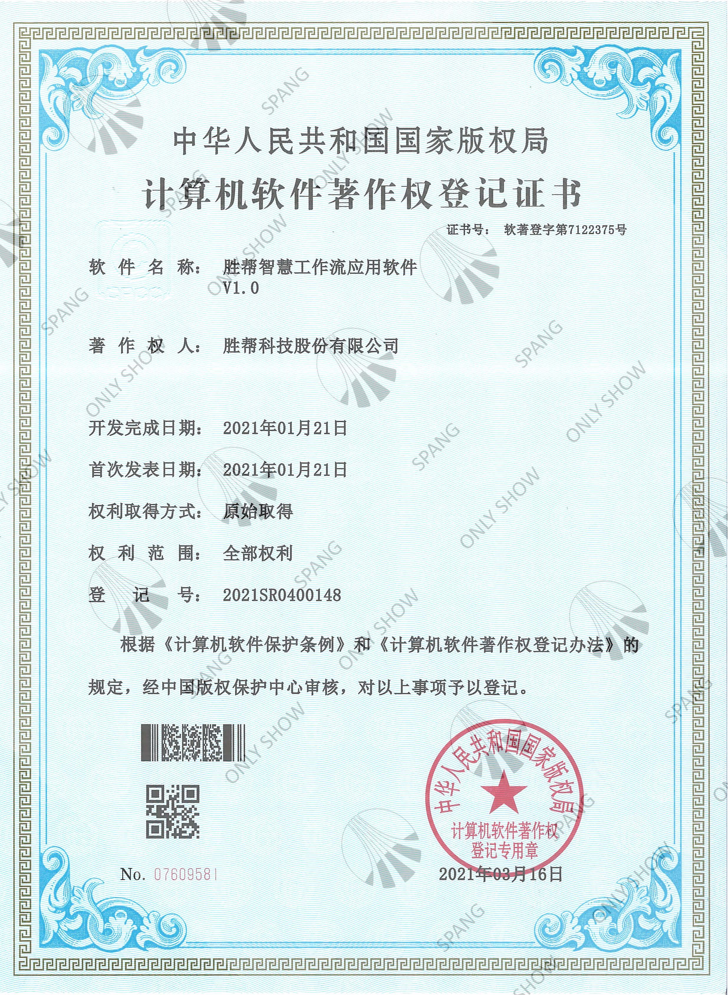 2021年316日,經(jīng)中國版權(quán)保護中心審核,勝幫科技正式獲得《智慧安監(jiān)管理系統(tǒng)應(yīng)用軟件》、《統(tǒng)一認證管理平臺應(yīng)用軟件》、《智慧工作流應(yīng)用軟件》三項計算機軟件著作權(quán)登記證書。