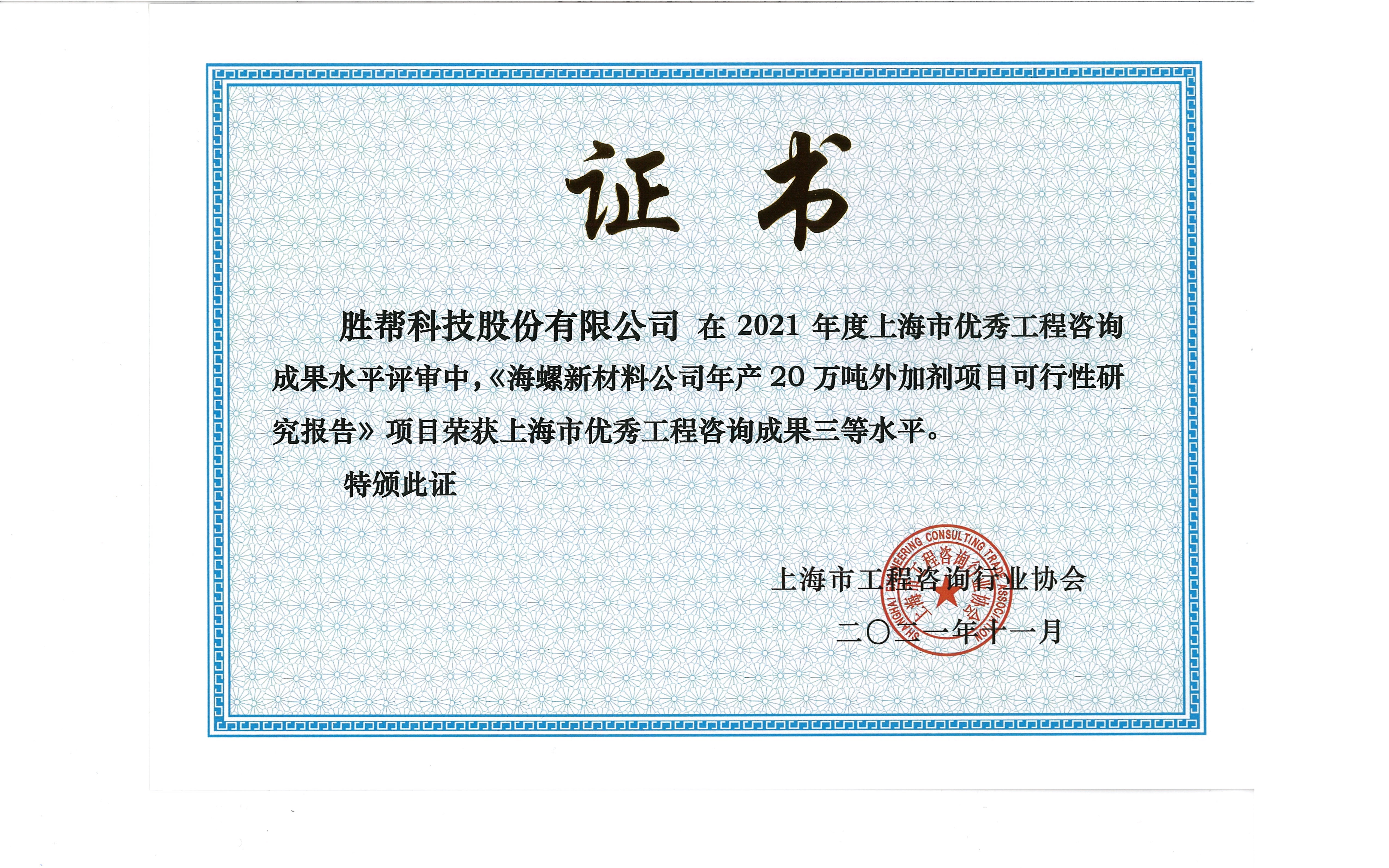 日前從上海市工程咨詢行業(yè)協(xié)會(huì)傳來喜訊,在“2021年度上海市優(yōu)秀工程咨詢成果獎(jiǎng)”評選中,我司編制的《新疆宣力環(huán)保能源有限公司600萬噸/年低階煤分質(zhì)利用、10萬噸/年LNG、5萬噸/年針狀焦、50萬噸/年危廢煤焦油提質(zhì)改造項(xiàng)目可行性研究報(bào)告》榮獲一等獎(jiǎng),《海螺新材料公司年產(chǎn)20萬噸外加劑項(xiàng)目可行性研究報(bào)告》榮獲三等獎(jiǎng)。