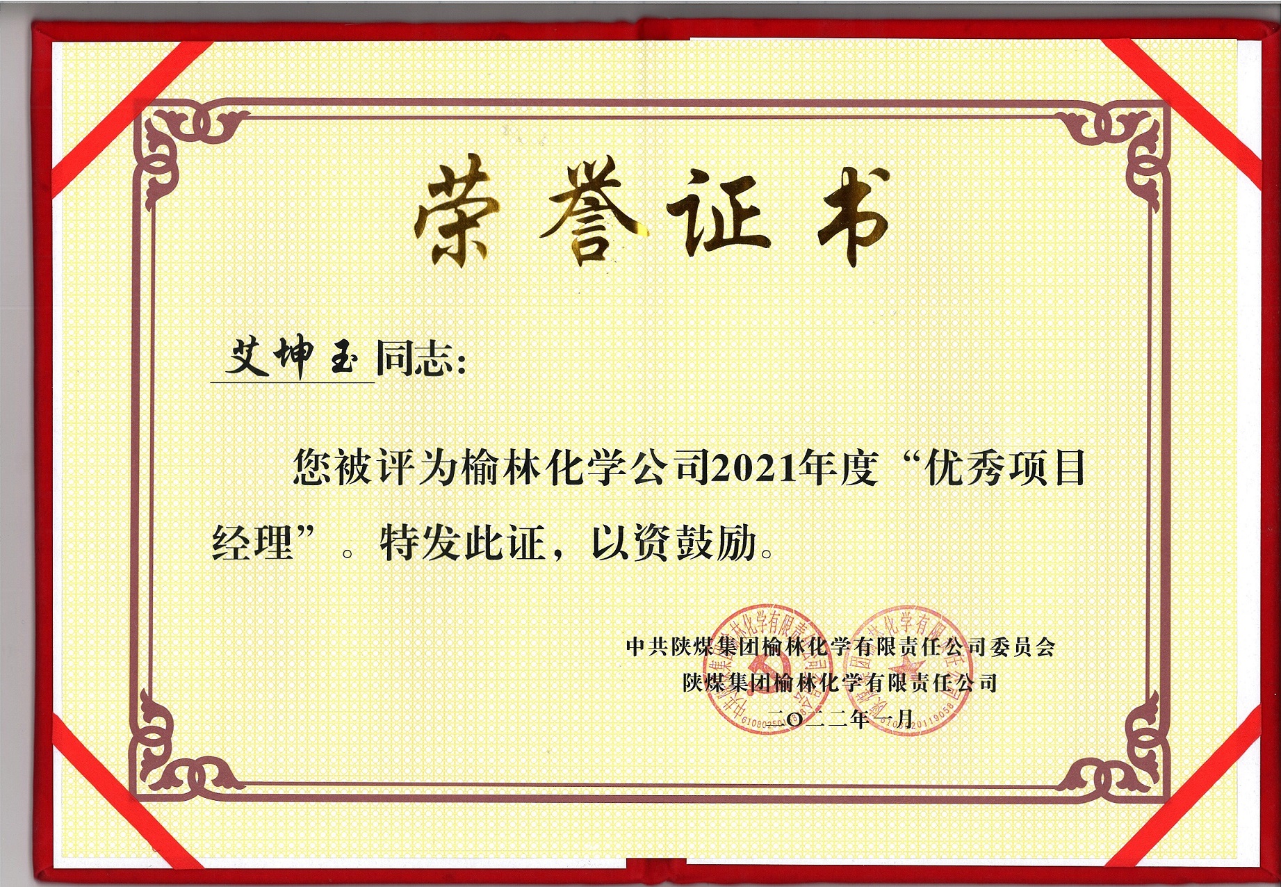2022年1月7日,陜煤集團(tuán)榆林化學(xué)有限責(zé)任公司組織召開2022年工作會(huì)暨安全工作會(huì),大會(huì)對2021年度先進(jìn)集體、先進(jìn)個(gè)人和年度科技創(chuàng)新成果進(jìn)行了表彰,我司艾坤玉同志榮獲榆林化學(xué)公司2021年度“優(yōu)秀項(xiàng)目經(jīng)理”稱號。