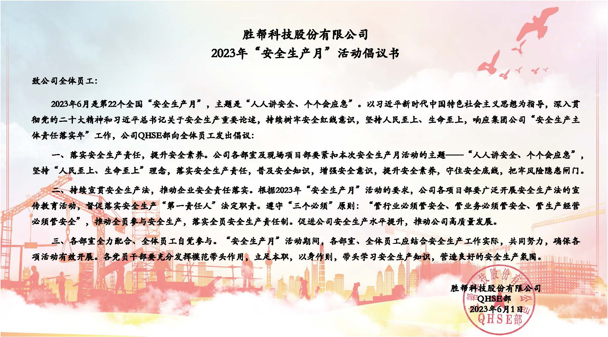 勝幫科技股份有限公司2023年“安全生產(chǎn)月”活動倡議書