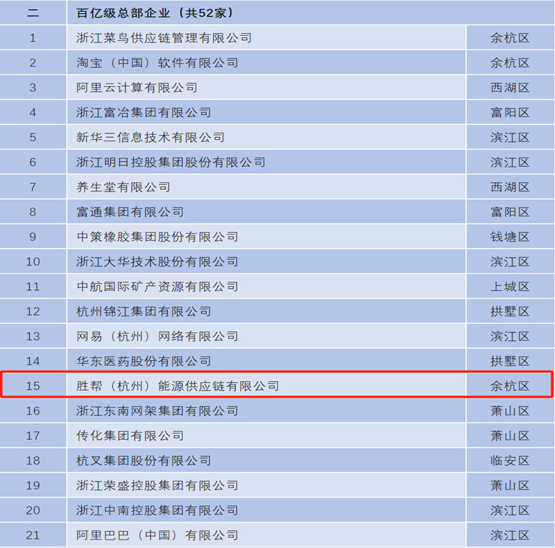 為扶持、培育和引進總部企業(yè),積極打造全國一流總部經(jīng)濟中心,杭州市首次組織總部企業(yè)認(rèn)定工作,認(rèn)定阿里巴巴等468家企業(yè)為2023年度杭州市總部企業(yè),包括民企總部394家、央企總部18家、外企總部56家。其中,根據(jù)企業(yè)營業(yè)收入規(guī)模,評出全市百億以上總部企業(yè)58家(余杭區(qū)4家),勝幫(杭州)能源供應(yīng)鏈有限公司入選,享受杭州總部經(jīng)濟扶持政策的第一波紅利。