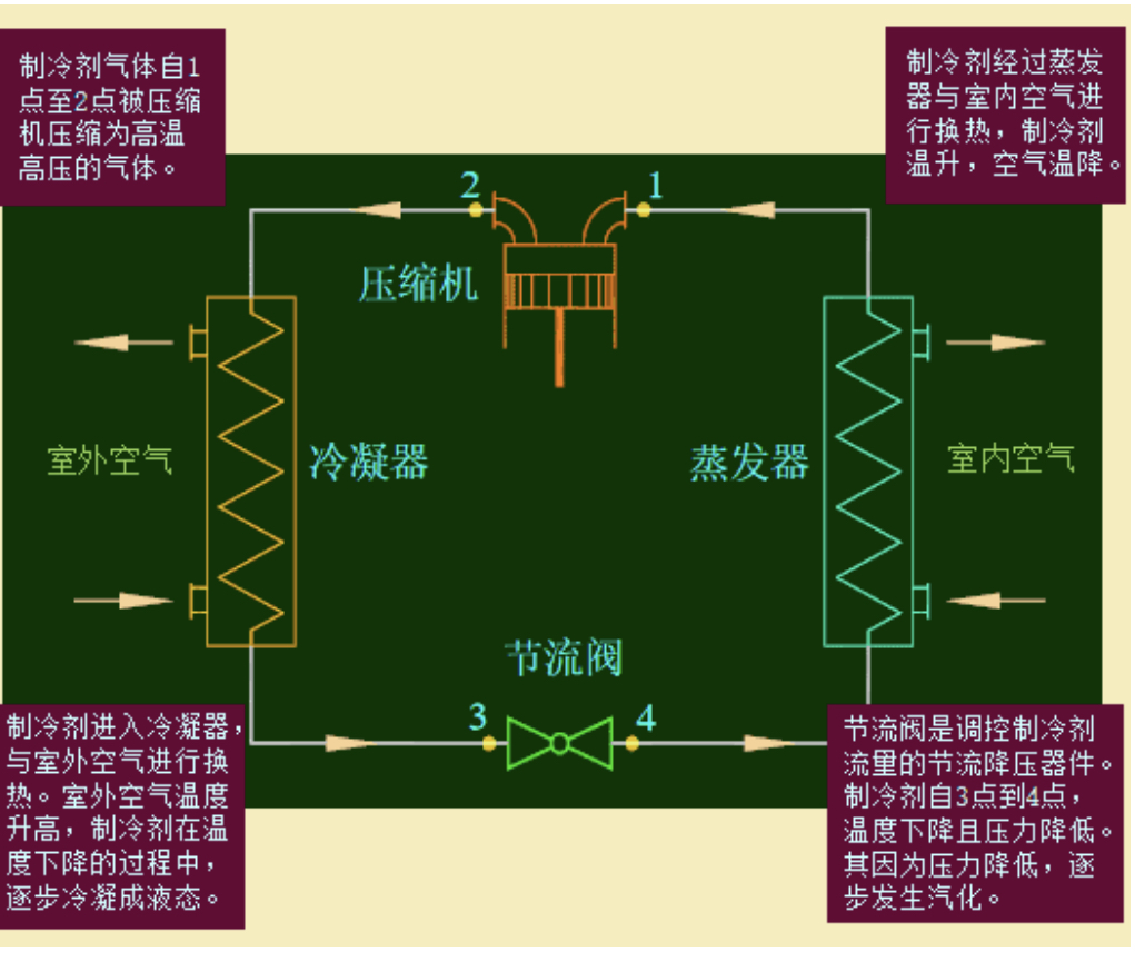 空調(diào)由四大部件組成,有蒸發(fā)器、壓縮機(jī)、冷凝器、節(jié)流閥(或膨脹閥)。還有一個(gè)重要的介質(zhì)便是制冷劑。夏季,室內(nèi)空氣通過(guò)進(jìn)風(fēng)口進(jìn)入機(jī)組內(nèi),蒸發(fā)器中的制冷劑吸收室內(nèi)空氣的熱量,制冷劑由低溫低壓的氣液混合物(氣體多、液體少)變?yōu)橹袦氐蛪旱臍怏w,之后經(jīng)過(guò)壓縮機(jī)壓縮為高溫高壓的氣體,再在冷凝器側(cè)放熱變?yōu)橹袦馗邏旱臍庖夯旌衔铮怏w少、液體多),后由節(jié)流閥減壓為低溫低壓的氣液混合物(氣體多、液體少),又回到蒸發(fā)器,循環(huán)往復(fù)。在蒸發(fā)器側(cè)被降溫后的空氣重新送入房間,冷凝器側(cè)放出的熱量在風(fēng)機(jī)的動(dòng)力下被室外空氣帶走。原理見(jiàn)下圖1。