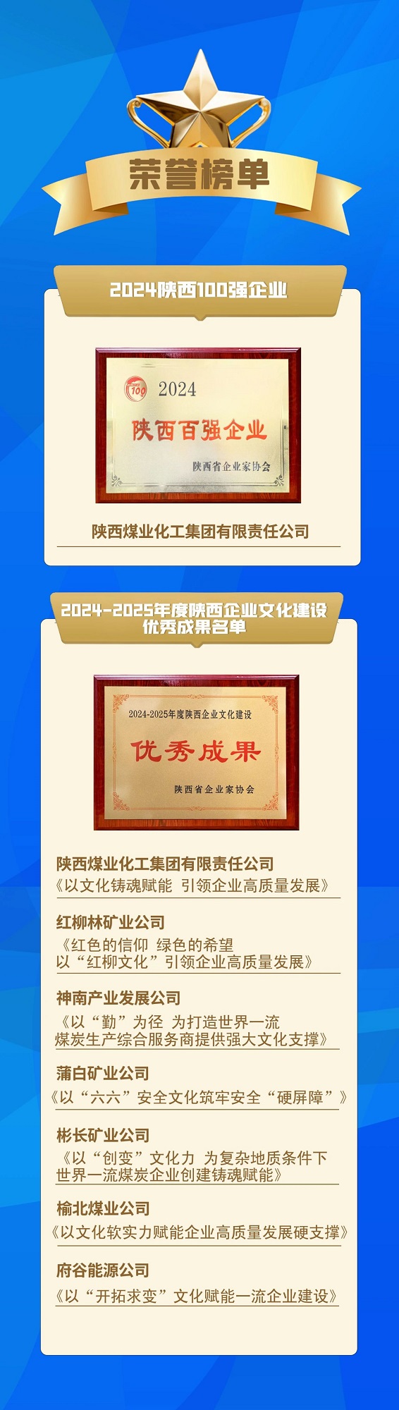 12月11日至12日,由陜西省企業(yè)家協(xié)會(huì)和楊凌示范區(qū)管委會(huì)聯(lián)合主辦的“2024陜西百強(qiáng)企業(yè)發(fā)布·第七屆企業(yè)文化年會(huì)暨名企進(jìn)楊凌活動(dòng)”在陜西楊凌舉辦。會(huì)上發(fā)布了2024陜西企業(yè)100強(qiáng)及民營企業(yè)50強(qiáng)名單、2024-2025年度陜西企業(yè)文化建設(shè)優(yōu)秀成果,并向獲獎(jiǎng)企業(yè)進(jìn)行授牌。陜煤集團(tuán)以2023年5293億元營業(yè)收入榮登2024陜西百強(qiáng)企業(yè)榜首,入選2024-2025年度陜西企業(yè)文化建設(shè)優(yōu)秀成果。