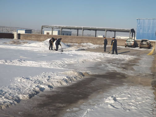 項(xiàng)目部管理人員清掃辦公區(qū)域積雪