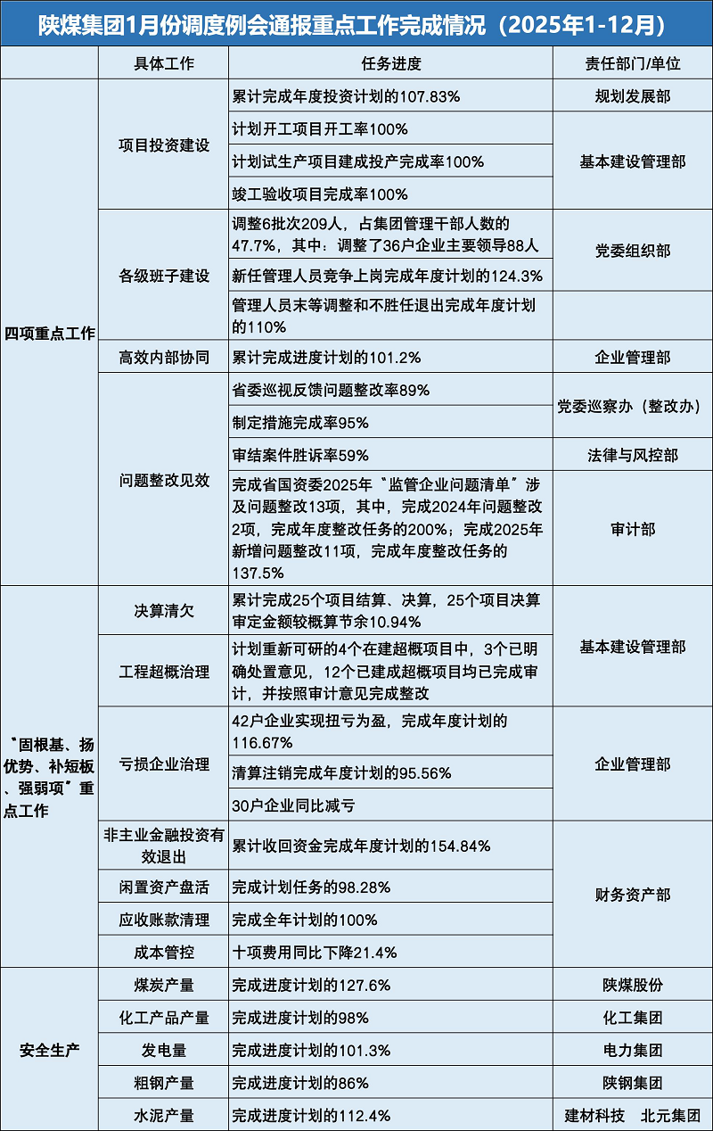 會(huì)議總結(jié)12月份及2025年重點(diǎn)工作任務(wù)完成情況,分析當(dāng)前工作存在的問題和不足,安排部署近期重點(diǎn)工作;相關(guān)職能部門分別匯報(bào)了項(xiàng)目投資建設(shè)、高效協(xié)同發(fā)展、各級(jí)班子建設(shè)、問題整改及安全環(huán)保、生產(chǎn)經(jīng)營、閑置資產(chǎn)盤活、虧損企業(yè)治理等重點(diǎn)工作推進(jìn)情況。