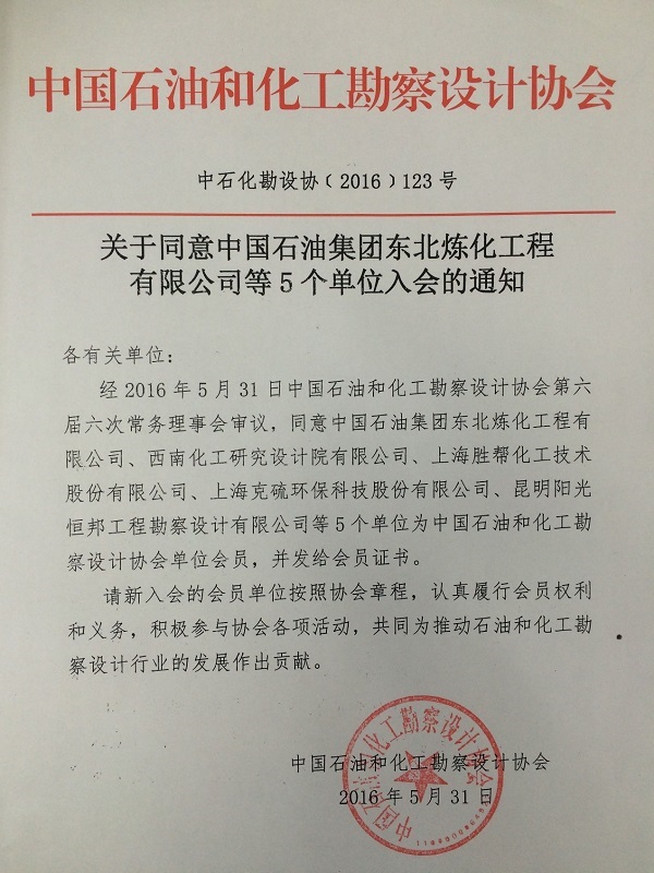 2016年5月31日,中國石油和化工勘察設計協(xié)會向我公司頒發(fā)了會員證,我司正式成為該協(xié)會會員單位。